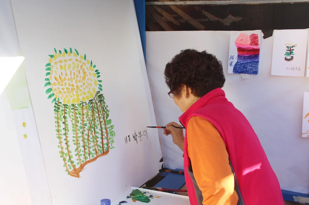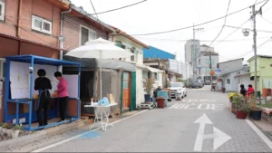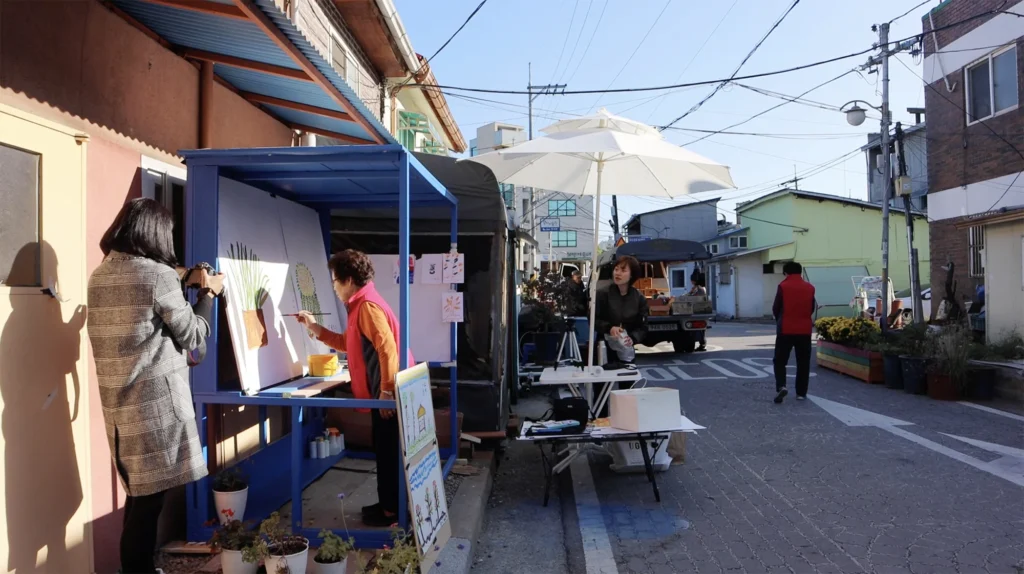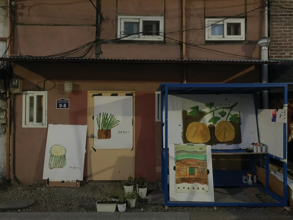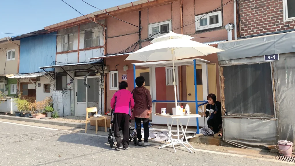 괭이부리마을 ‘행복이 있는 화장실’, 그 앞의 세 갈래 길모퉁이는 주민들의 사랑방이자 카페처럼 사용되는 스팟이다. 삼삼오오 모여 앉아 간식과 이야기를 나누고 트럭에서 장을 보거나 그 길을 오가는 사람들을 통해 현재의 시간과 날짜도 알 수 있다. 해와 바람에 따라 조금씩 자리가 바뀌고, 누구나 초대받을 수 있지만 아무나 차지할 수 없으며 시시각각 달라지는 풍경 그 자체인 이곳을 나는 이라 명명했다. 가끔 문밖 살롱 멤버가 되면 자연스럽게 애초의 계획을 실행할 기회를 엿보곤 했지만, 그 노력은 수포가 되곤 했다. 나의 계획은 문밖 살롱 생리에 맞지 않고 어색했다. 나는 문밖 살롱 시스템이 작동하는 리듬에 맞춰 잠시 들고 나가는 프로그램을 준비했고, 멤버들의 유쾌한 저항은 원동력이 되어 새로운 풍경을 만들었다.